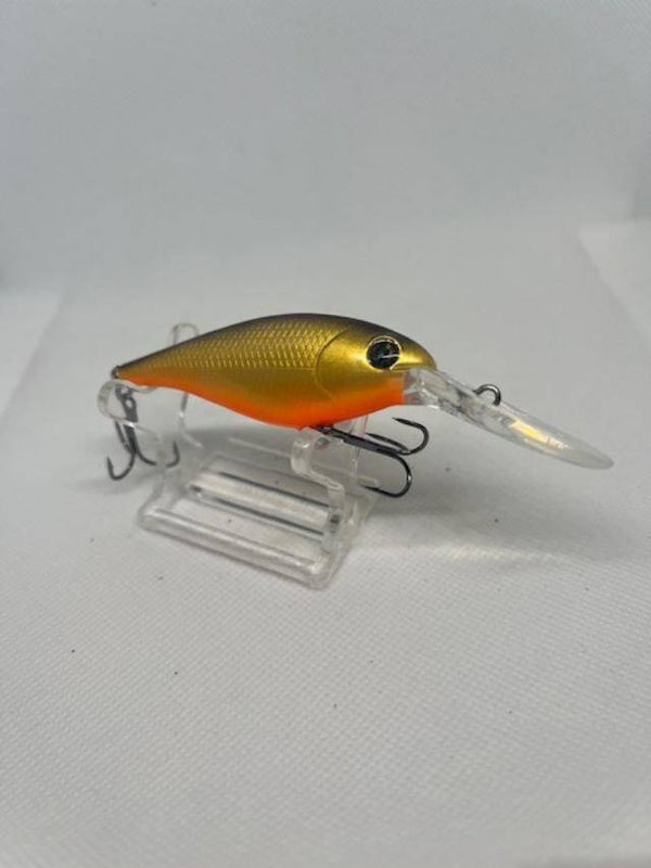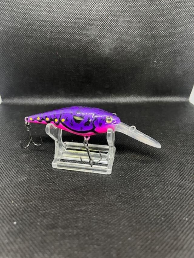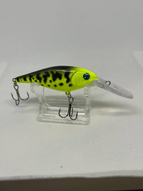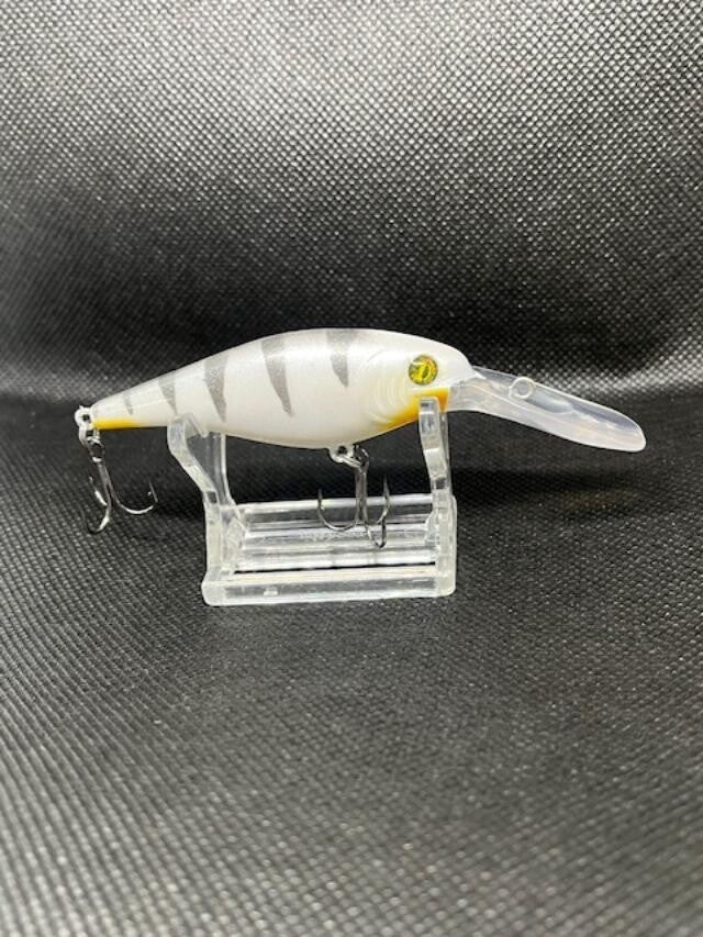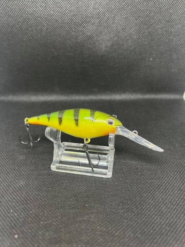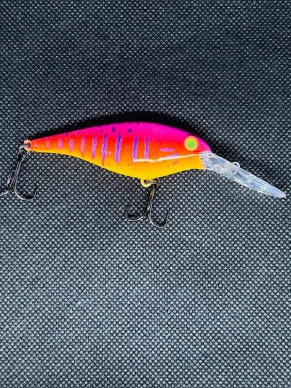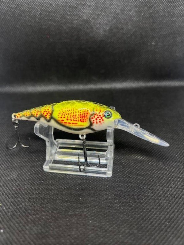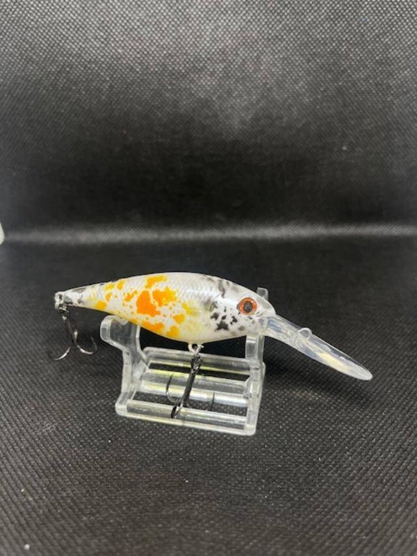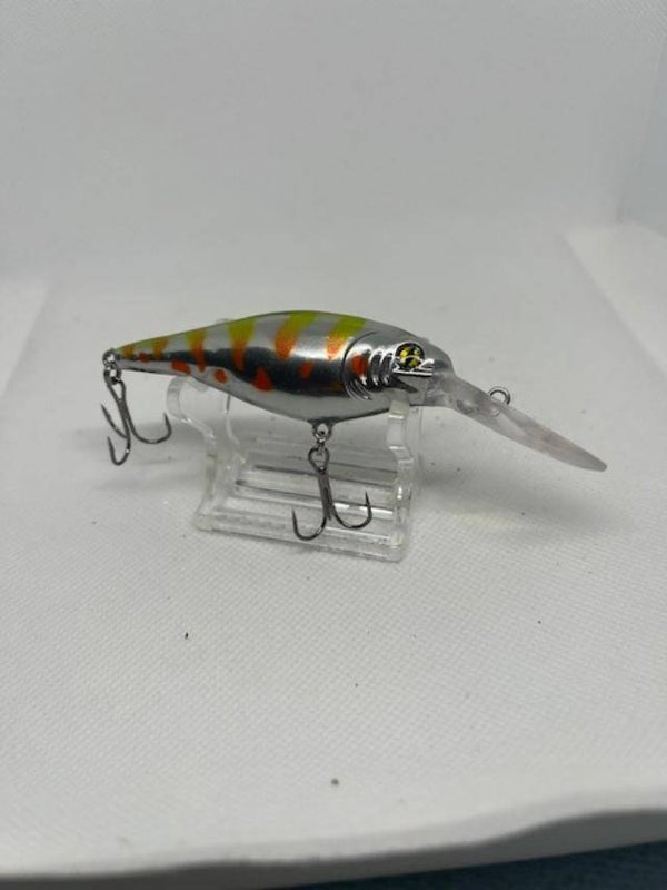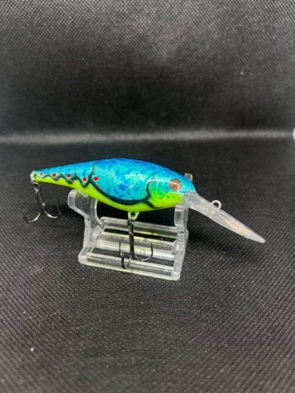 Flickr 7. Body 2-3/4" over all 3-7/8" Weight 5/16 with hooks. Dives 10'-13'